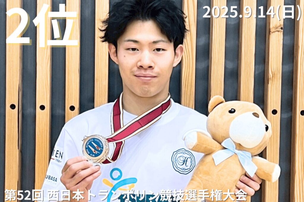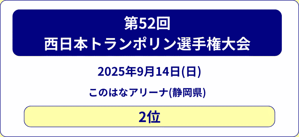 | 2025/9/12 ~14 | 第52回 西日本トランポリン選手権大会 | このはなアリーナ (静岡県) | 予選 3位 決勝 2位 |