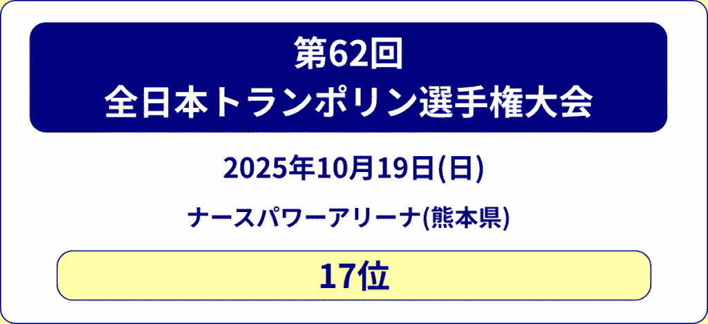 | 2025/10/17 ~19 | 第62回全日本トランポリン競技選手権大会 | ナースパワーアリーナ (熊本県) | 予選 14位 決勝 18位 |