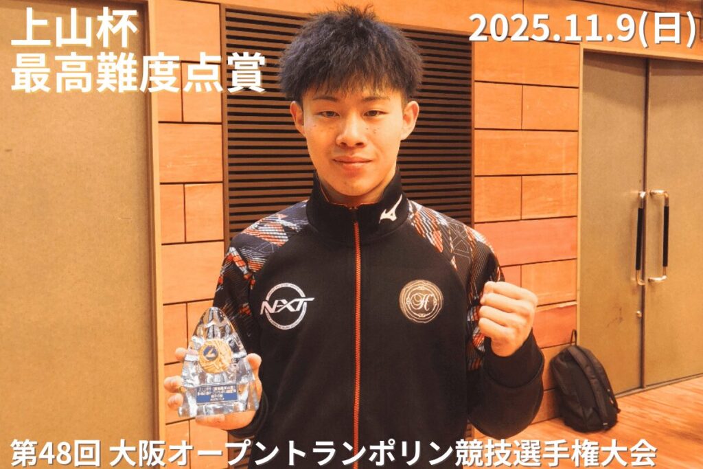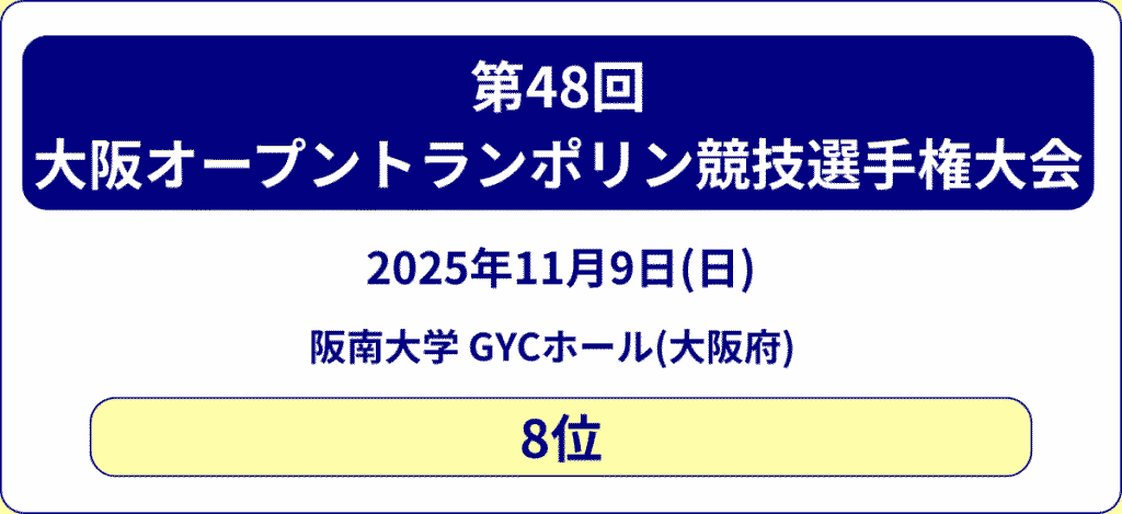 | 2025/11/8 ~9 | 第48回大阪オープントランポリン競技選手権大会 | 阪南大学 GYCホール (大阪府) | 8位 上山杯 (最高難度点賞) |